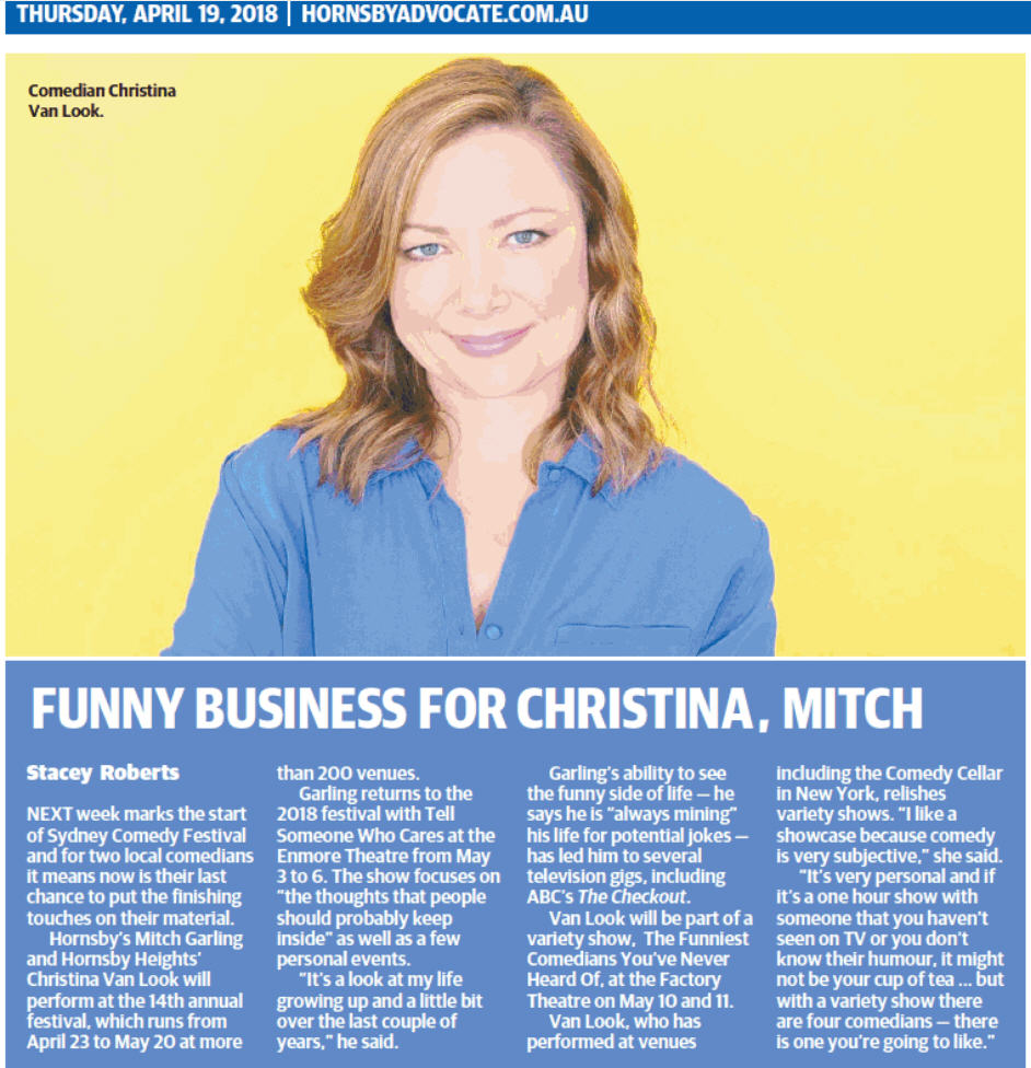 If you’re keeping an eye on Sydney Comedy Festival News, you may have noticed that today’s Hornsby Advocate newspaper features comedian Christina Van Look.